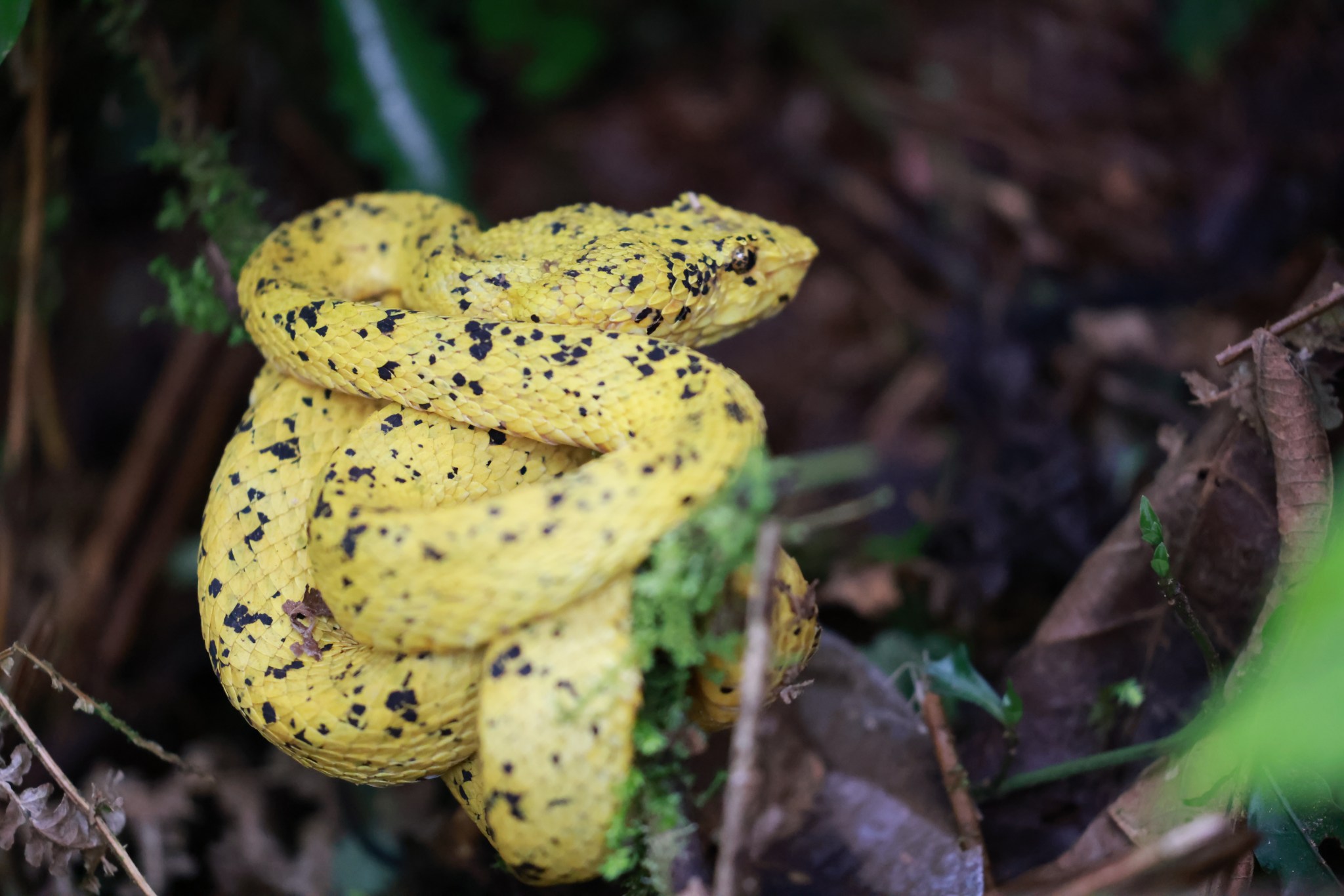We got back a little after eight, and then I had two long video calls. In the afternoon, we went to the private reserve Sky Adventures. They have all sorts of zip lines and such, but we just wanted to go for a walk in the forest, which also has two long hanging bridges. It was nice to see the treetops up close. The diversity of bromeliads, creepers and epiphytes that was growing on each tree was truly amazing, and reminded me of a dense coral reef. Besides the beautiful vegetation and birds, we were lucky enough to also see a group of spider monkeys in the treetops, as well as a special find – an Eyelash Palm-Pitviper (Bothriechis schlegelii) that was lying motionless on the side of the trail, justifying its reputation as a specialized ambush predator. This little tree viper earned its name thanks to two distinctive characteristics: the “eyelashes” – elongated scales protruding above the eyes (one dubious theory is that they help protect the eye from small branches and twigs), and the heat-sensing pits located along the upper lip, which help it sense its prey – mostly small warm-blooded rodents and birds up in the trees. Juvenile snakes prefer to hunt closer to the ground, as their prey consists more of small lizards and frogs, which they sometime lure by wagging the brightly colored tip of their tail that resembles a small worm.