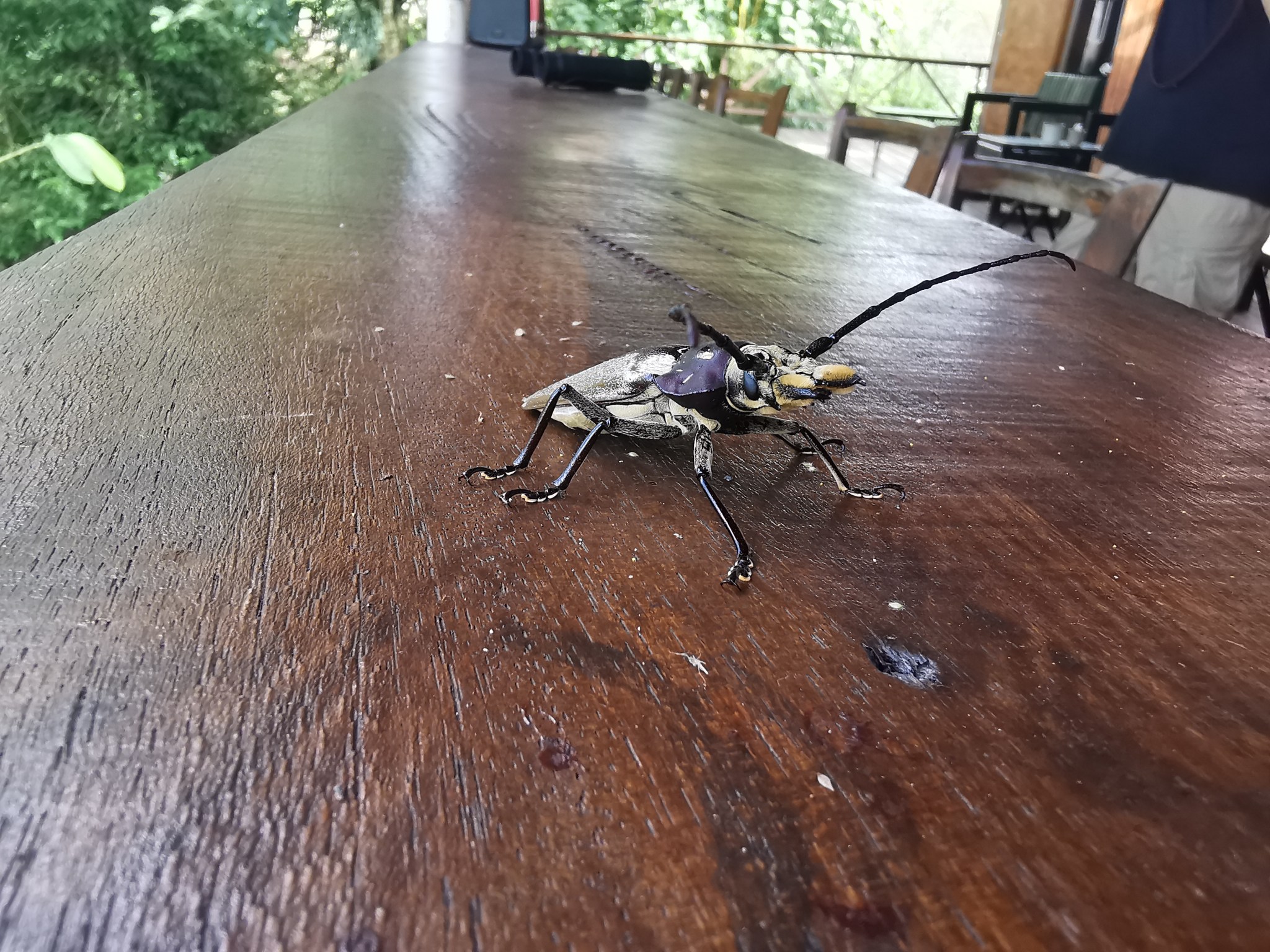 We woke up early and went out to the balcony to the sound of birds. And indeed, there were quite a few in sight including several large black vultures. One of them shared a nearby tree with a Yellow-throated Toucan. Lilach, Daniel and I headed out before 7, for an early morning a swim in a nearby stream fed by hot springs. The flow was relatively fast and shallow, and quite hot at places. Different spots offered different temperatures, with one particular spot offering a mix of hot and cold currents – a strange and unique experience. On the way back, Lilach and I had coffee at SLOFFEE cafe (a combination of the words “Sloth” and “Coffee”), while Daniel preferred to stay in the car and read. We didn’t see a sloth, but the trees beyond the porch provided plenty of bird sightings, and a large and impressive longhorn beetle landed right on the counter in front of us.