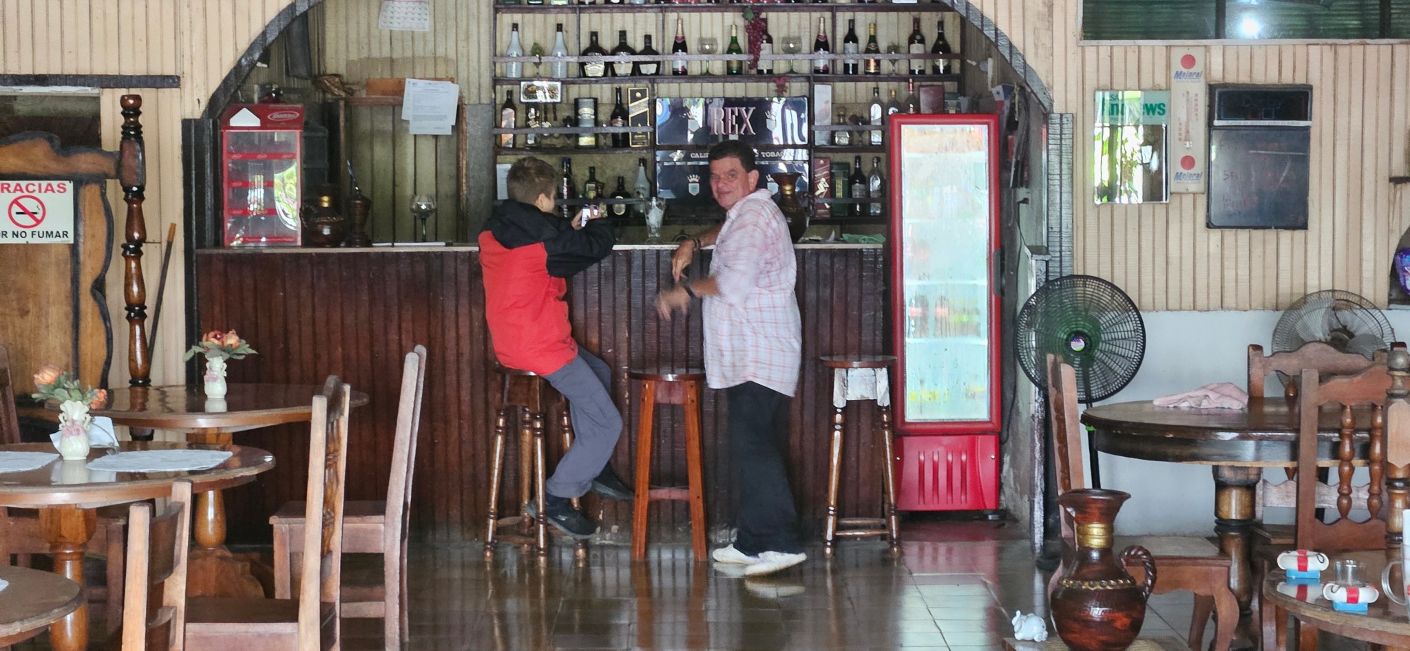 After everyone had showered (luckily the villa had three bathrooms!), we headed south toward Corcovado Park and the Osa Peninsula. At some point, we noticed we were almost out of gas. While navigating to the next gas station — we decided to continue 30 kilometers ahead instead of going 5 back — the fuel gauge jumped from showing enough gas for a 50 km drive directly to a reserve of 0 km. We continued on, full of hope and with our adrenaline heightened, just as it started to rain. Within two minutes, it turned into a downpour the like of which we had never seen before. Luckily, within a couple of minutes more we reached the gas station, thrilled to have found both gas and shelter. We stopped to eat at a roadside restaurant across the intersection, which we shared with three workers, one of whom had a huge machete resting on his knees. Tamar made friends with the owner, sitting at the bar and chatting with him about this and that.